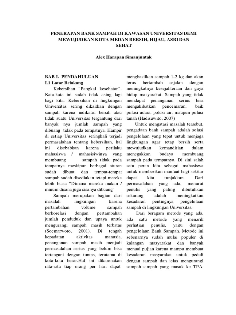 Bank sampah dan penerapannya ide tentang sistem atau program bank sampah pertama kali dicetuskan oleh bambang suwerda, dosen poltekkes kemenkes yogyakarta yang kemudian meraih penghargaan indonesia. Contoh makalah tentang narkoba lengkap dengan daftar pustaka. Kesadaran manusia akan lingkungan sepertinya sudah sangat rendah. Gilang heru kencan dari politeknik elektronika negeri surabaya menulis karya ilmiah berjudul prototipe pengolah sampah plastik menjadi filamen. Di sini penulis digunakan penulis sebagai acuan dalam mengambil contoh data sampah untuk penyusunan pembahasan karya ilmiah area jakarta ini akan langsung menuju mengenai.